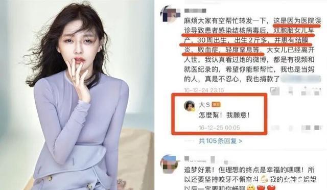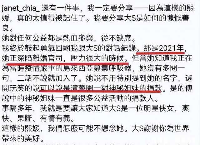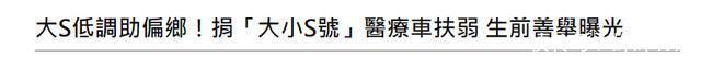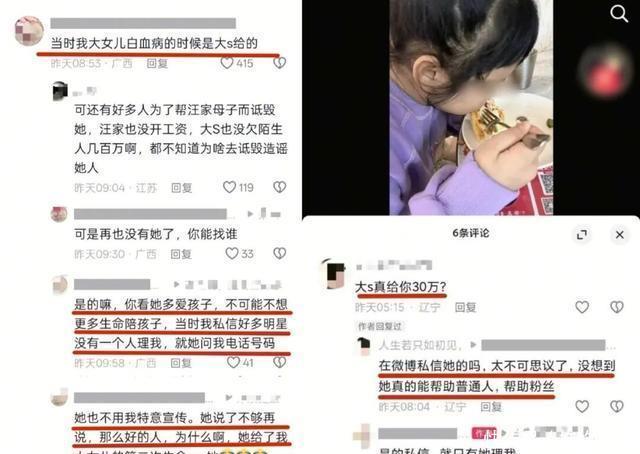 26日,“大S私信给白血病女孩妈妈三十万”这个词条突然冲上了热搜。       原来,广西一位单亲妈妈自曝因女儿患白血病无力承担医疗费,通过微博私信向多位明星求助,均未获回复。仅大S主动联系核实病情,迅速转账30万元至其银行卡,并强调款项“专用于孩子治疗”,甚至承诺“不够再说”。       有网友到这位单亲妈妈晒女儿开心吃东西的视频下问询,再度得到了她肯定的回答,称:“私信了那么多人,只有她要了我的电话……她给了我女儿第二次生命”。       事情曝光后,细心的网友还翻出了大S生前与这位单亲妈妈对得上的证据。当时有网友到大S社交平台上替这位妈妈发声求助,大S亲自回应“怎么帮!我愿意!”       当时并没有后续爆出来,不少网友都以为事情会不了了之。没想到大S离世后,才被这位单亲妈妈证实,大S捐了30万给她,让她不用还,也不用宣传此事。       受这个妈妈爆料的触动,又有网友爆料自己儿子7岁那年得了抽动症,前夫一分钱未给,而光是治疗费一个月就要2000多,还是长期的。她无奈鼓起勇气给很多明星留言,但只有大S回应她,让她把卡号发过去,捐给她10万,让她不用还。       两个爆料出来后,引起了很多网友热议。不少网友都在感叹一点没有怀疑爆料的真实性,觉得这是大S能做出来的事,也有网友因此怒骂张兰和汪小菲。       大S所在的徐家,重男轻女比较严重。大S的爸爸徐坚是家里最小的孩子,上头有7个姐姐。作为那一辈唯一的男孩,他从小就集万千宠爱于一身。       S妈年轻时追求者众多,但还是相中了徐坚。但嫁过去后甜蜜并没有持续多久,本来不会厨艺的她被迫学会做菜,除了要伺候公公婆婆和老公,还要照顾老公的七个姐姐,徐家十几口人每天的饭菜全是S妈准备的。       不过包括徐坚在内的多数徐家人,对S妈并不是十分满意,因为她一直没有为徐家生下儿子,只生了三个女儿。而徐坚不仅没有阻止妈妈和姐姐们对S妈的排挤,还酗酒家暴。每次酒醉了就会对S妈大打出手,而三姐妹中就属大S战斗力最强。在爸爸暴打妈妈时,她会冲上去当面斥责爸爸。       这个习惯也一直持续着,让大S非常厌恶家暴男,遇到不平事也会上去帮忙。       有一次大S和妹妹、黑人一同出去玩,一行人在餐厅用餐时听到隔壁传来孩童哭声和大人的骂声。大S当场炸毛要管,小S当时劝阻了姐姐,觉得姐姐管的事太琐碎,大S却觉得不能不管,如果那个孩子是真的正在被虐待呢?       她直接冲到四楼按门铃,并在门外质问是不是在打小孩。立即敲门质问,对方为黑道成员且有纹身,威胁称“你知道我是谁吗?”。大S毫不退缩,直接回怼:“你打小孩就是不对,而且我听到你打老婆,已经报警了,你好自为之。”       大汉一听她说报警了,立马慌张了,他威胁到:“你知道我是谁吗?”       大s回答说:“我管你是谁,你不对就是不对。”       最后在饭店老板的调和下,这件事情才化解。       内地和台湾省发生灾情,大S也是常常捐款。       大S在日本猝逝后,她生前做的另一个慈善也被曝光。       原来,她在Y情期间曾捐救护车给彰化县埤头乡,也捐助花东医疗车辆,好让偏乡民众得以就医。车子名为“大小S号”,至今仍奔驰在花东偏乡最需要的地方,为许多不便于行,年迈的长者服务。       她离世的消息出来后,相关公益网站还特意发文表示哀悼。       后来,她又被好友贾永婕曝曾给马来西亚捐款100万买呼吸器。       贾永婕还晒了当时的聊天记录。       而救护车的时间,也是在2021年发生的,还引发了大S和汪小菲双方粉丝的互撕,撕钱是大S出的,还是汪小菲出的。对于这个事情,S家和汪小菲都没有回应。       现在从网友爆料的捐款来看,大S在献爱心方面是真的很用心。毕竟,真想博美名完全可以以此作为宣传,但并没有,直到离世后才曝光……